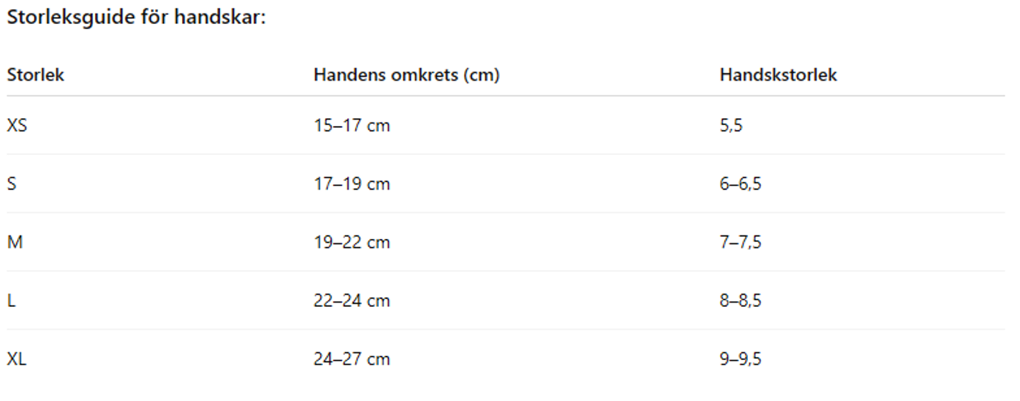 För att hitta rätt storlek ska du mäta omkretsen på din hand runt den bredaste delen, vanligtvis över knogarna utan tumme, och använda en storleksguide som utgångspunkt.