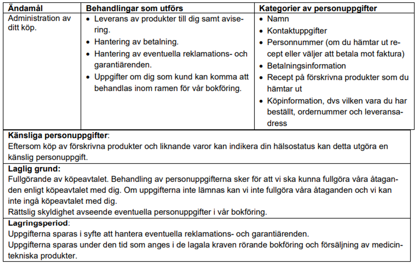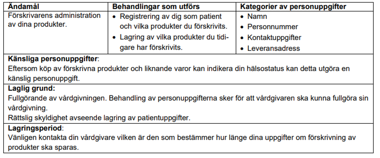 Administreringen av dina förskrivningar utförs av den förskrivande vårdgivaren i Mediqs system vilket innebär att Mediq är personuppgiftsbiträde till din förskrivande vårdgivare. Nedan i detta avsnitt återfinns generell information om denna behandling, varvid den aktuella vårdgivaren (personuppgiftsansvarig) kan ge ytterligare information på begäran.