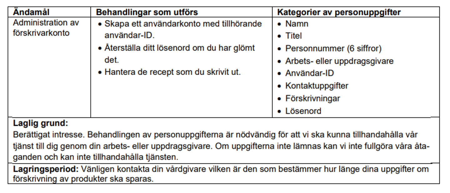 Vår behandling av personuppgifter hänförliga till dig som förskrivare regleras via ett avtal mellan Mediq och din arbetsgivare (personuppgiftsansvarig). Nedan i detta avsnitt återfinns generell information om denna behandling, varvid din arbets-/uppdragsgivare kan ge ytterligare information på begäran.